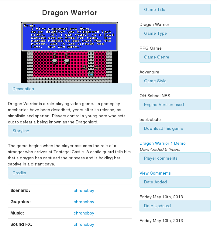 The websites are also built using Python, which could technically enable the use of Nohrio the Python-based toolkit for OHRRPGCE. This could be implemented in the future to enable metadata to be extracted from the games. I am already able to extract a game's title screen from an RPG file, which could enable an automatic title screen to be displayed along with the game, no uploading of a title screen required. Rather you just upload in-game screenshots. These are just ideas.