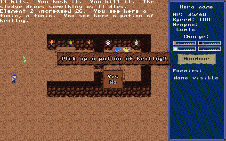 Ichiro decided he wanted to continue to work on the battles. Which is fine by me, gives me more time to make the rest of the dungeons cooler. I just hope he gets them done with enough time to spare for me to balance everything together. Today I mostly did a bunch of boring but necessary additions to the script. Ichiro drew some graphics which was a huge morale boost to me. Here's a tip for future collab contest entrants: as soon as you've planned the game with your partner IMMEDIATELY try to get something done to show to them. If you're the artist draw something, if you're the scripter get something running on the screen, just... anything. It shows them you're serious and it gets them to start being serious. Anyhow check out the new screen:
